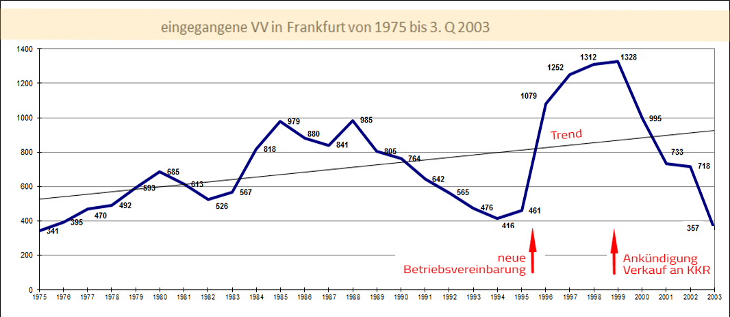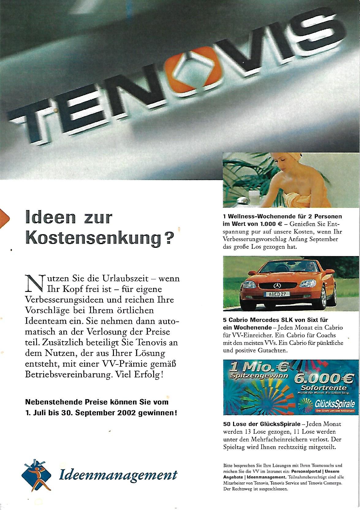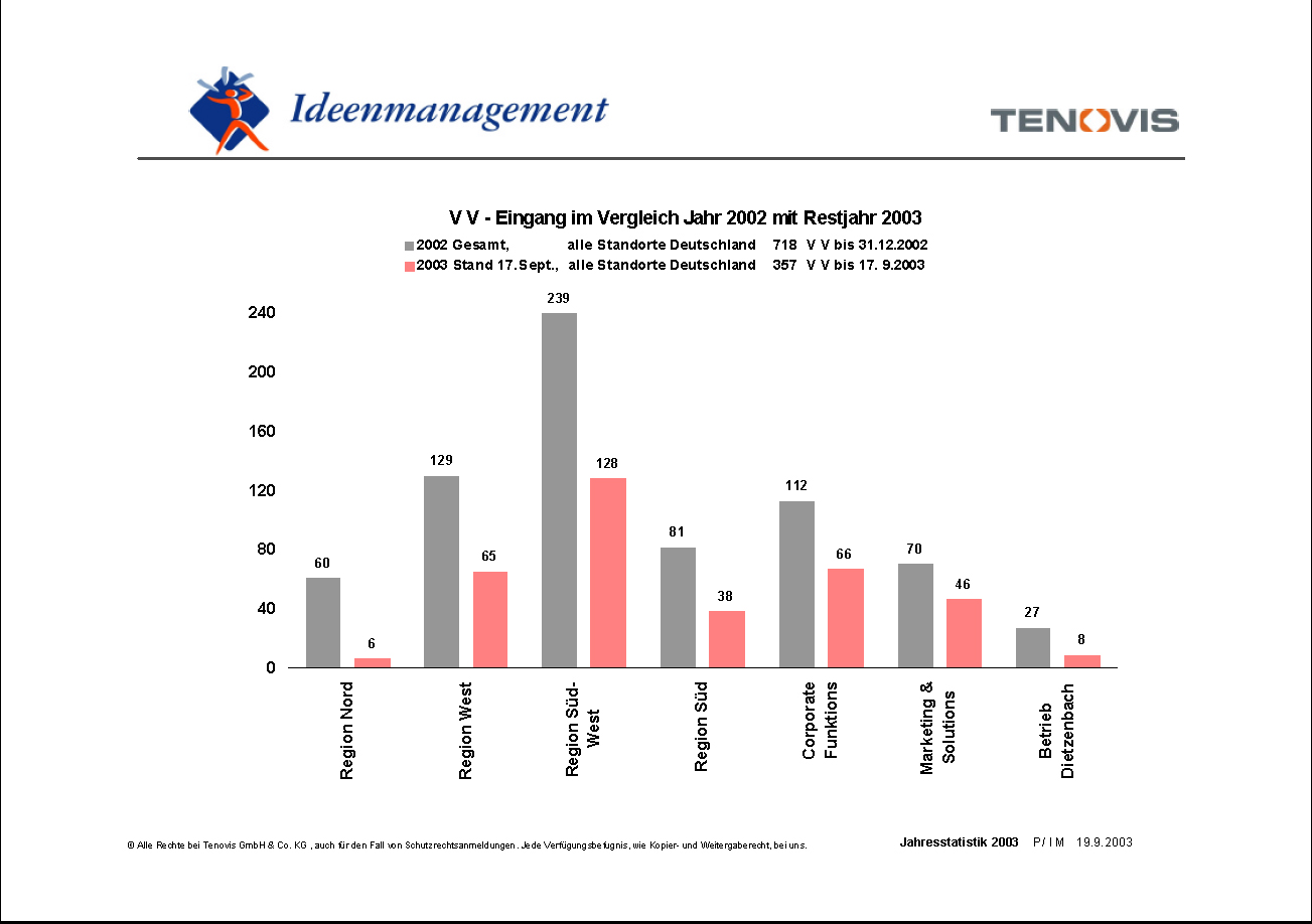 2004 vor dem Verkauf von Tenovis an AVAYA wurde die o.g. Betriebsvereinbarung gekündigt und die Bearbeitung von kreativen Ideen der Mitarbeiter den Vorgesetzten überlassen. Die Statistik endet deshalb im 3. Quartal 2003: