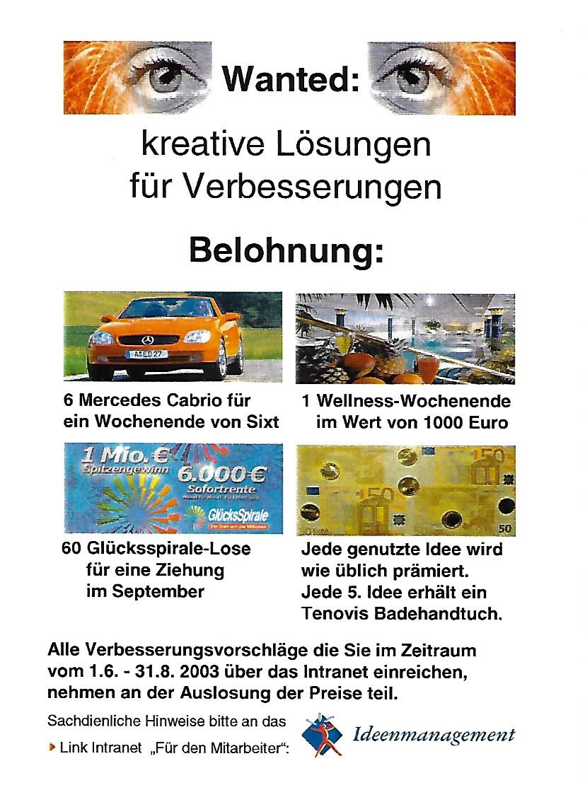 Die Personalleitung bat alle Vorgesetzten anlässlich der Mitarbeitergespräche auf die Erhöhung der Mitarbeiterbeteiligung am Betrieblichen Vorschlagswesen hinzuweisen. Ideenmanagement ist Führungsaufgabe. Wo Freiräume und Auseinandersetzung mit bestehenden Prozessen gewährt wurden, konnte nachhaltiger Nutzen für das Unternehmen generiert werden. In der Fabrikation hat dieses Instrument gelebt. In den restlichen Unternehmensbereichen bedarf es immer wieder Aufforderungen Top Down.